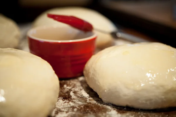 Gently remove the dough from the bowl and divide into two pieces. Proof the dough in bannetons or on a parchment-lined baking sheet dusted with semolina or corn meal. Brush oil or melted butter on the exposed part of the dough and loosely cover with a cloth towel or plastic wrap. Let rise for about 3 - 4 hours.
